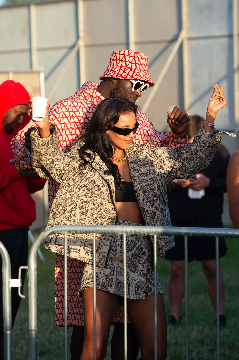 Maya Jama attends Glastonbury in a Dior skirt and Jacket with Stormzy, wearing a Valentino co-ord in 2024.