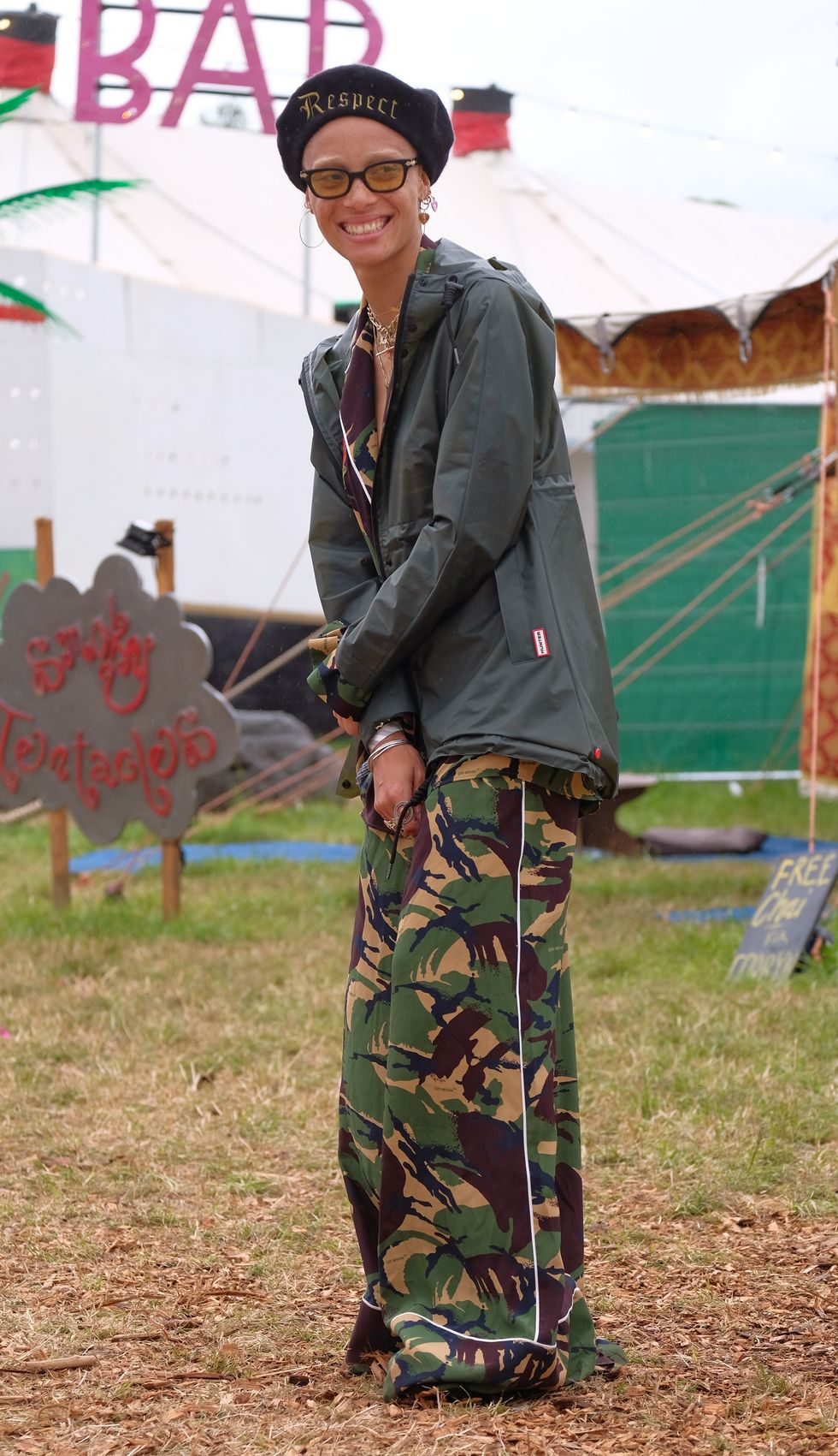 Adwoah Aboah in a matching camo pajama set with a Glastonbury staple, a leather jacket, in 2017.