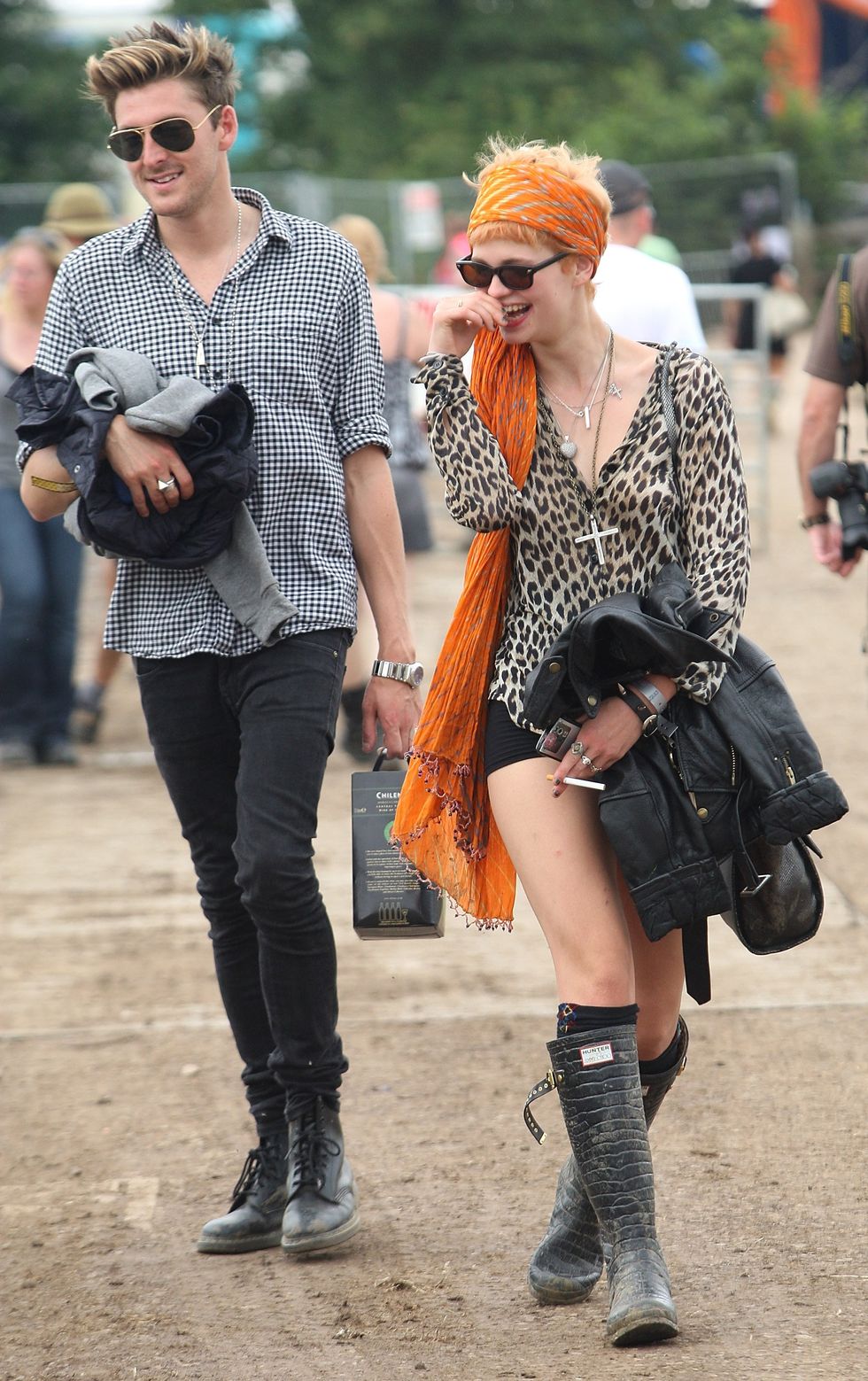 Pixie Geldof was a Glastonbury constant. Here at Glastonbury in 2009, she wears Hunter Wellington boots, a breezy leopard print blouse, and orange scarf aound her head.