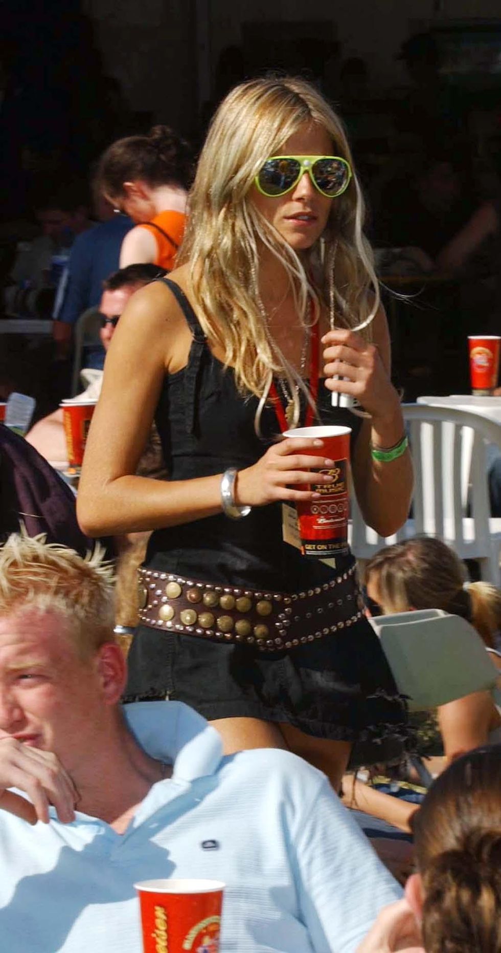 Sienna Miller in 2004 wearing those now iconic neon framed aviator glasses, a black sundress, and a bohemian embellished belt slung low on the hips.
