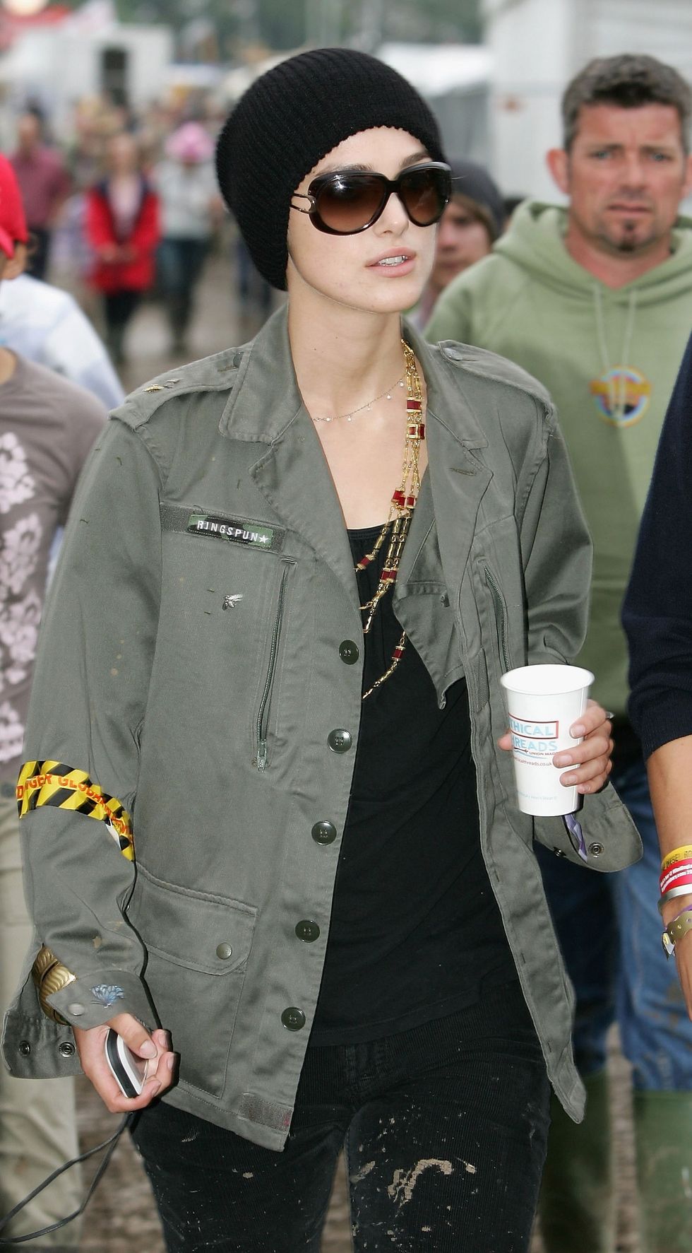 Keira Knightley in 2005. The military jacket, dark sunglasses, and muddy jeans says it all.