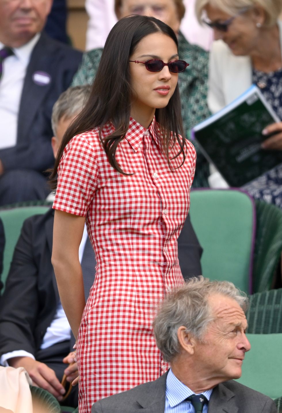 Olivia Rodrigo arrived at Wimbledon wearing a red gingham Ralph Lauren dress that she coordinated with a red Khaite bag (not pictured) and slim sunglasses.