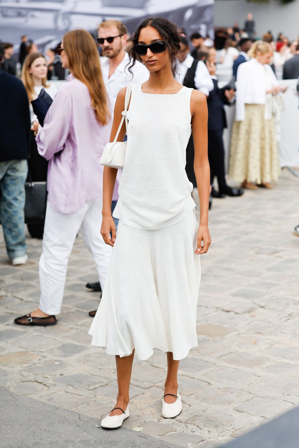 The model was spotted at Paris Fashion Week wearing a breezy ensemble with a matching white AlaĂŻa Bag and flats.