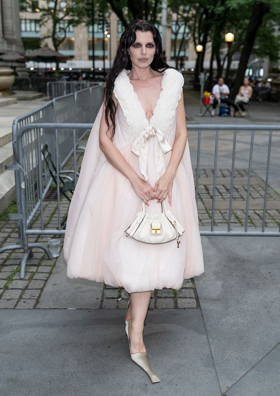 Also in New York: Alex Consani arriving at Marc Jacobs’ Fall 2025 show in a simple but very It-girl-coded jeans and black top ensemble, accessorizing with a small Hermès Birkin and red ballet flats. Starring in the show, Consani arrived earlier in the day, while Julia Fox arrived at the New York Public Library show location in time to catch the 7:30pm sharp show wearing a voluminous lace and silk baby pink dress from the designerâs Spring 2025 show with matching satin shoes.