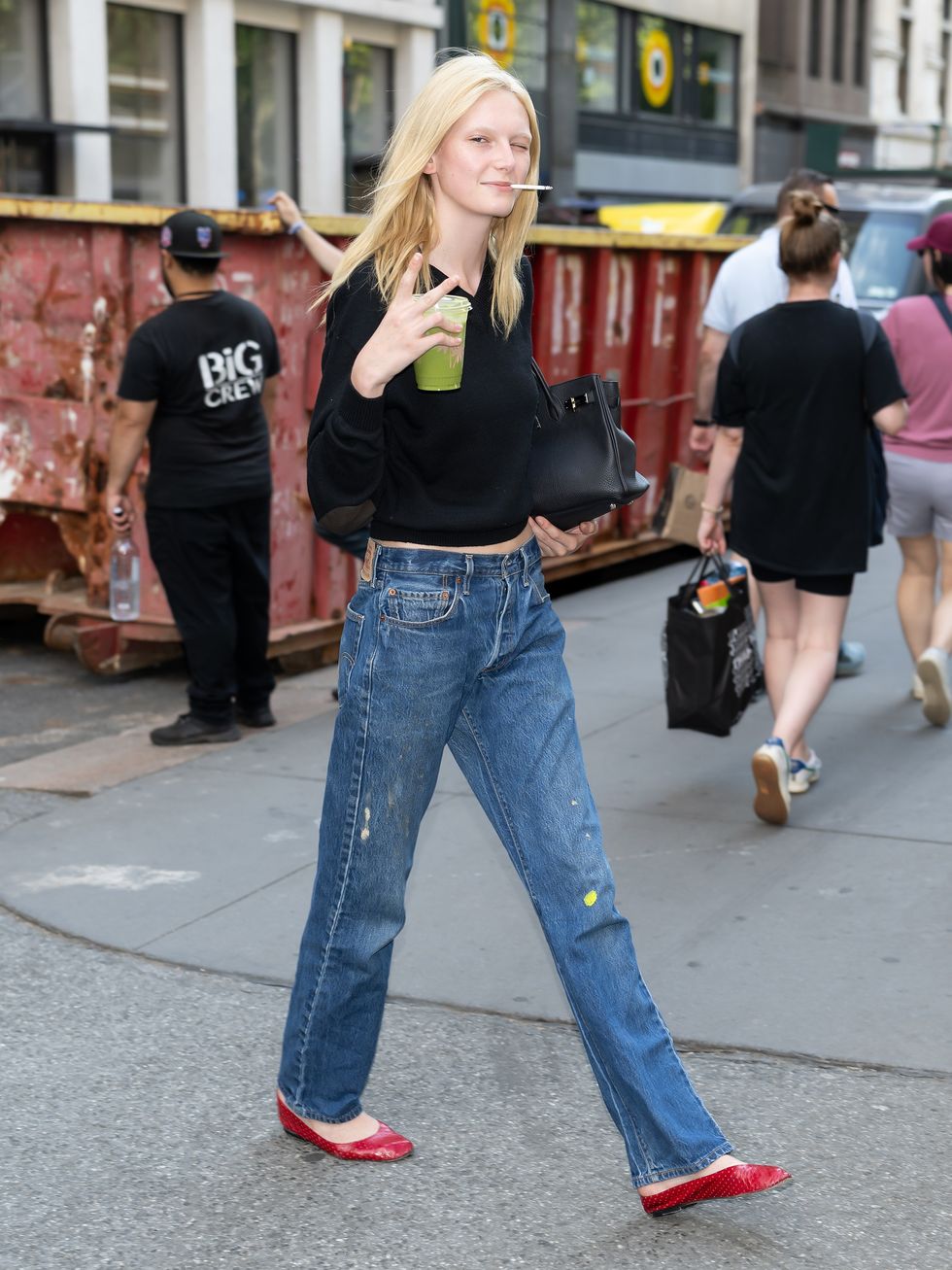 Alex Consani showed up backstage at the Marc Jacobs show in a black v-neck sweater, vintage blue Levi’s jeans, red ballet flats, and a black leather Birkin.