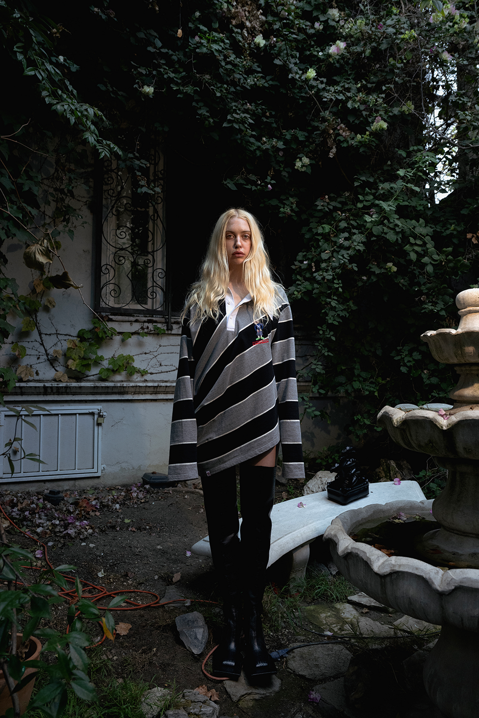 One of the ways she’s evolving her personal style is by seeking inspiration from the streets of her hometown of Los Angeles. “When I walk around Silver Lake, I’m just like, oh man. I love [it here],” she says. “But the styles are different throughout LA. West Hollywood people wear cool workout gear; in Silver Lake, it’s more alternative.” Though her personal clothing choices diverge from her Euphoria character, she still appreciates Faye’s specific taste. “I think she loves cute things, in the way that old ladies love cute things,” she says. “Like, how 90-year-old women love crochet or a bow and a little bunny—something that’s so cute, so sweet.”