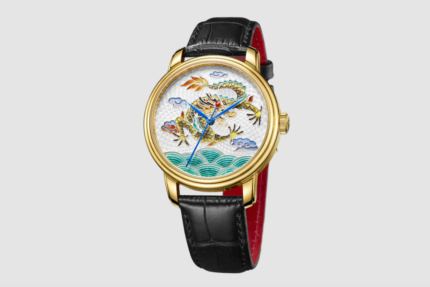 An affordable cloisonné enamel dial watch with a gold-plated case. (Image: Beijing Watch)