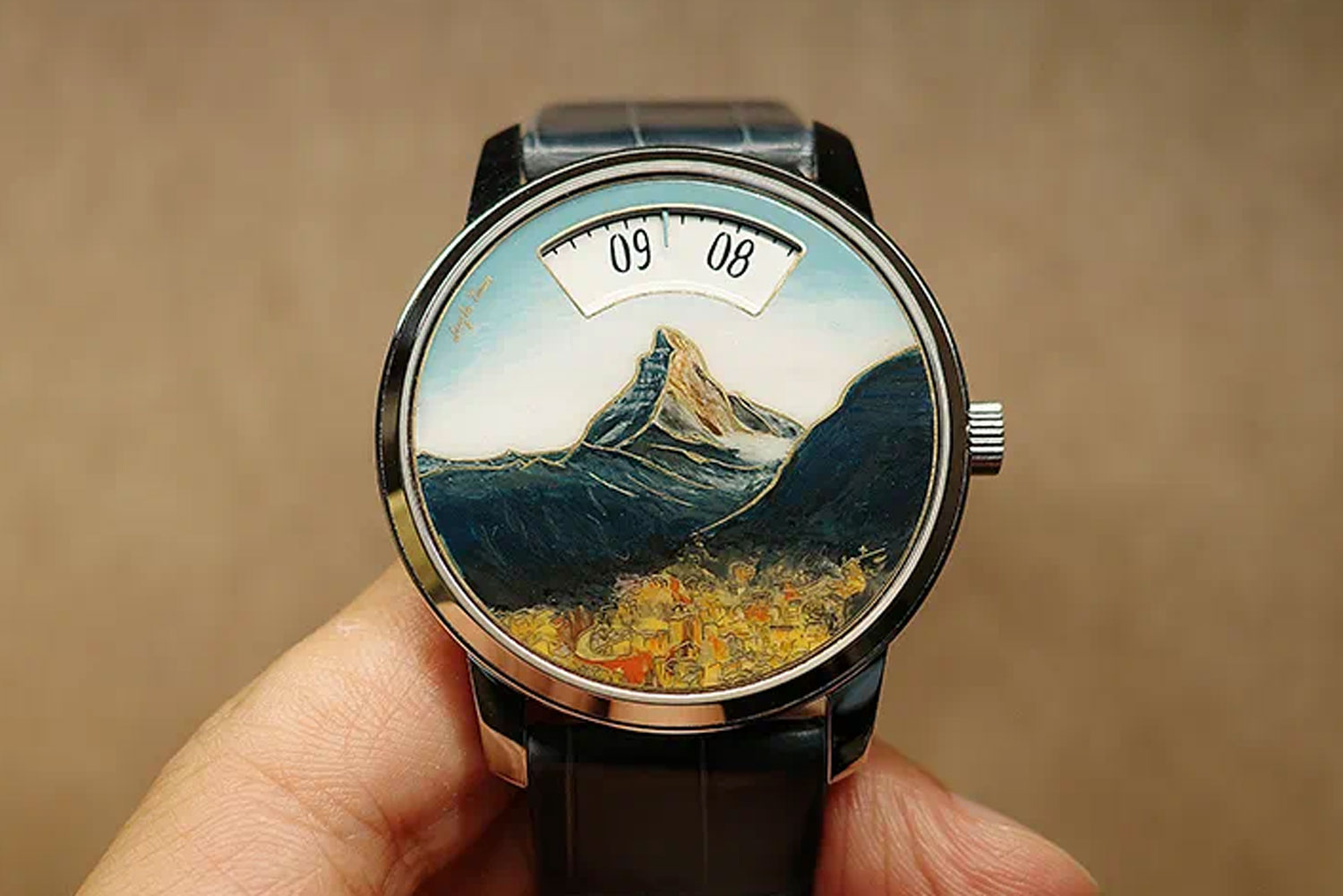 The depth and magnificence of the Matterhorn are beautifully captured in this enamel dial, inspired by the watchmaker’s visit to Switzerland. The logo is subtly engraved at 10 o’clock, then filled and polished. (Image: Ctime)