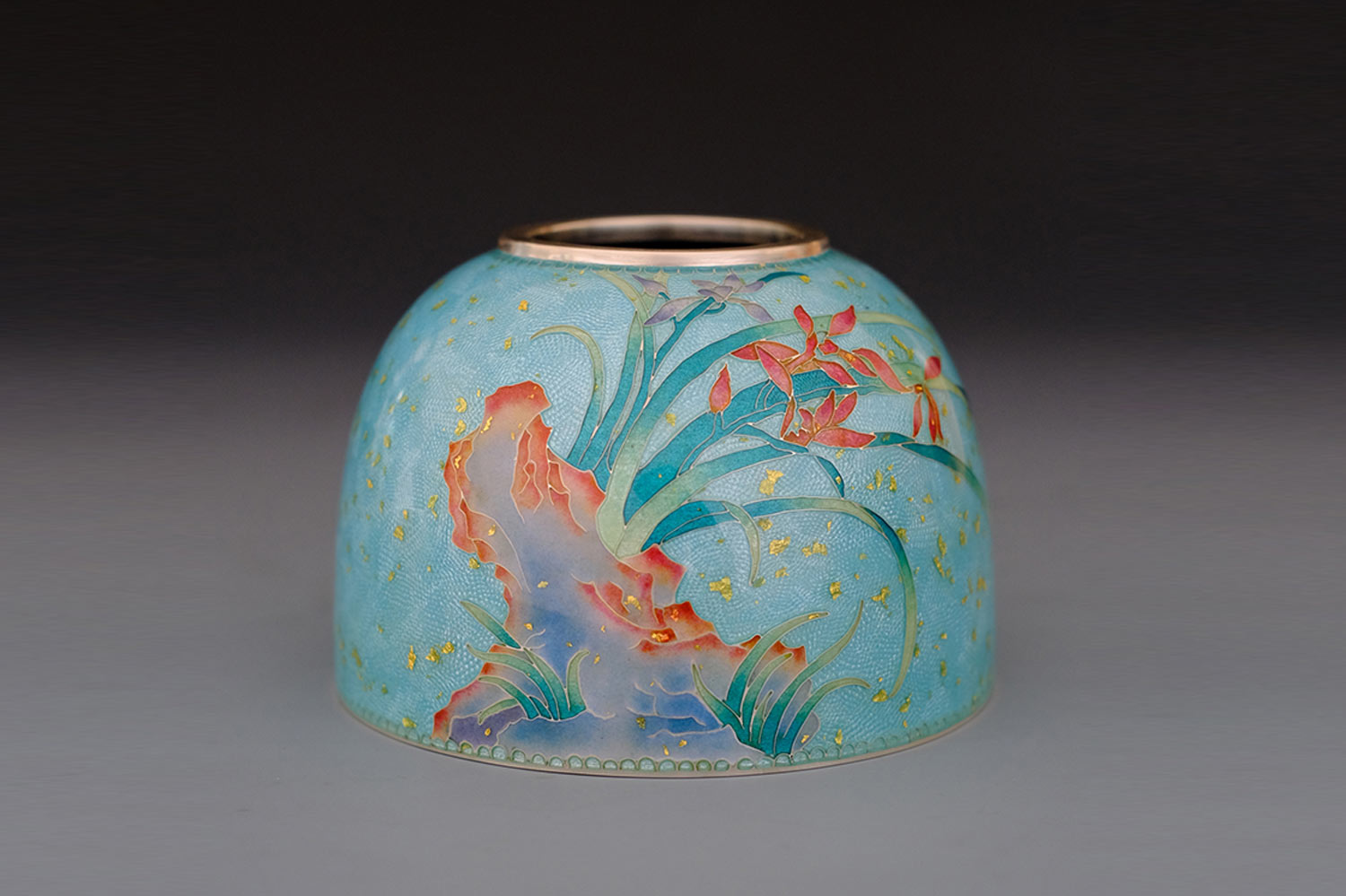 The workshop also produces other enamel pieces, from fine jewellery to large vases, but this water pot stood out. Once used by scholars to dilute ink for calligraphy, it is rarely seen today, and the Chinese ground orchid on stone is executed with remarkable detail and restraint. (Image: Shoushi Gonghe)