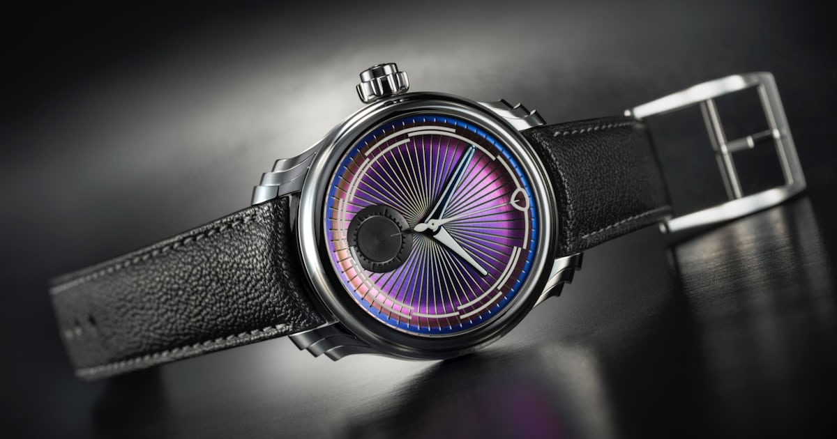 Accompanying the new, more flamboyant case design, the 57.04 Iris comes with an equally attention-grabbing new dial finish. What might be familiar are the laser-cut indices on the underside of the top sapphire crystal, filled with Ming’s proprietary Polar White lume compound, as well as the shape of the blue hour, minute, and central chronograph seconds hands (coated, not heat-blued). However, new to this is the iridescent dial treatment over the brass dial base, which gives it a chameleon-like quality, constantly shifting between the cold color spectrum of purples, blues, and even sometimes a hint of green. Physically, the dial is quite deeply dished and engraved with radial spokes that act as minute markers at the dial’s edge. But the color is certainly the star of the show.
