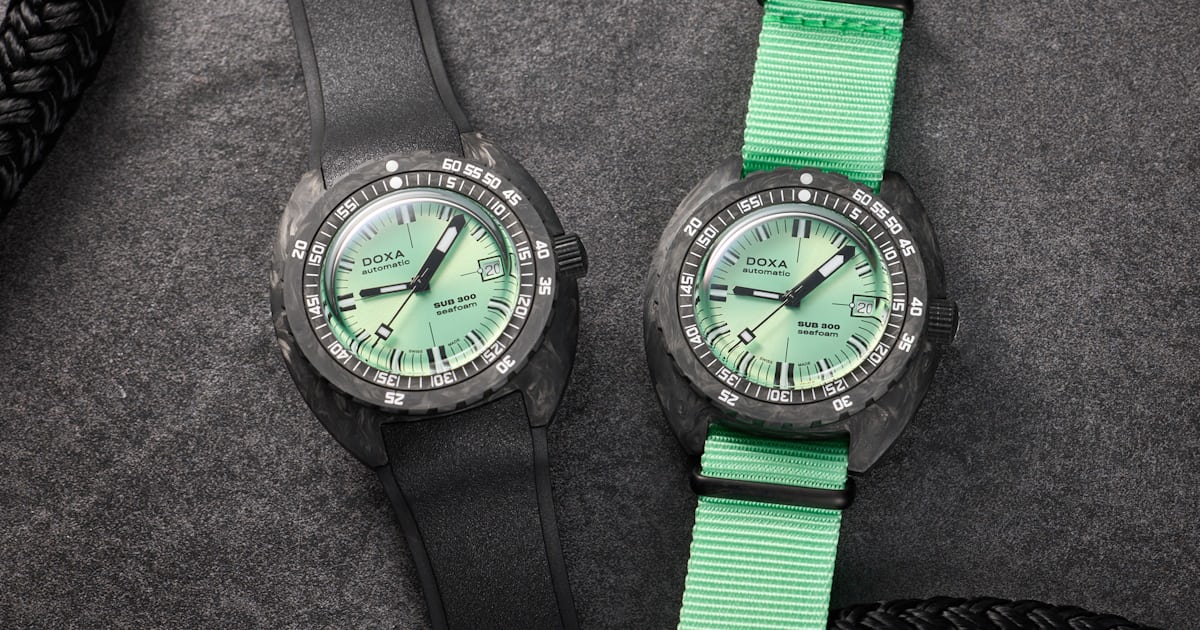 Hot off the presses for your Monday morning, we have a brand new carbon Doxa that continues the brand’s Seafoam colorway limited edition models with Watches of Switzerland. Following the established format of the carbon-clad spin on the classic Doxa dive watch shape, this new edition has a light green dial, comes with a matching light green NATO, and is limited to just 100 pieces.