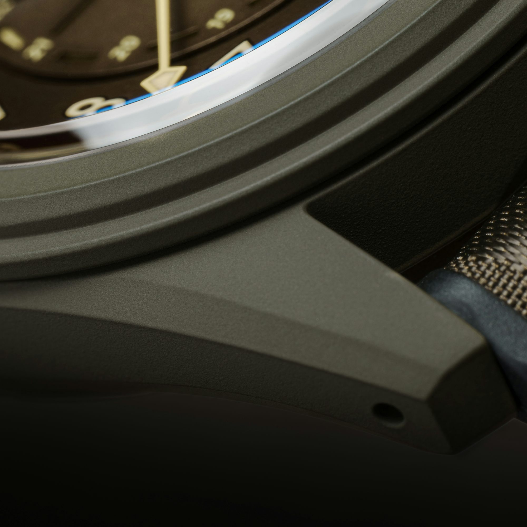 The arrow hand is not a GMT, but rather the central running seconds. The handset and dial indices feature Super-LumiNova BGW9 Grade A lume. The Grade 2 Titanium case has nice facets along the lugs, but the olive Ceracote treatment gives the entire watch a matte finish (except the crown and caseback, which are left raw).