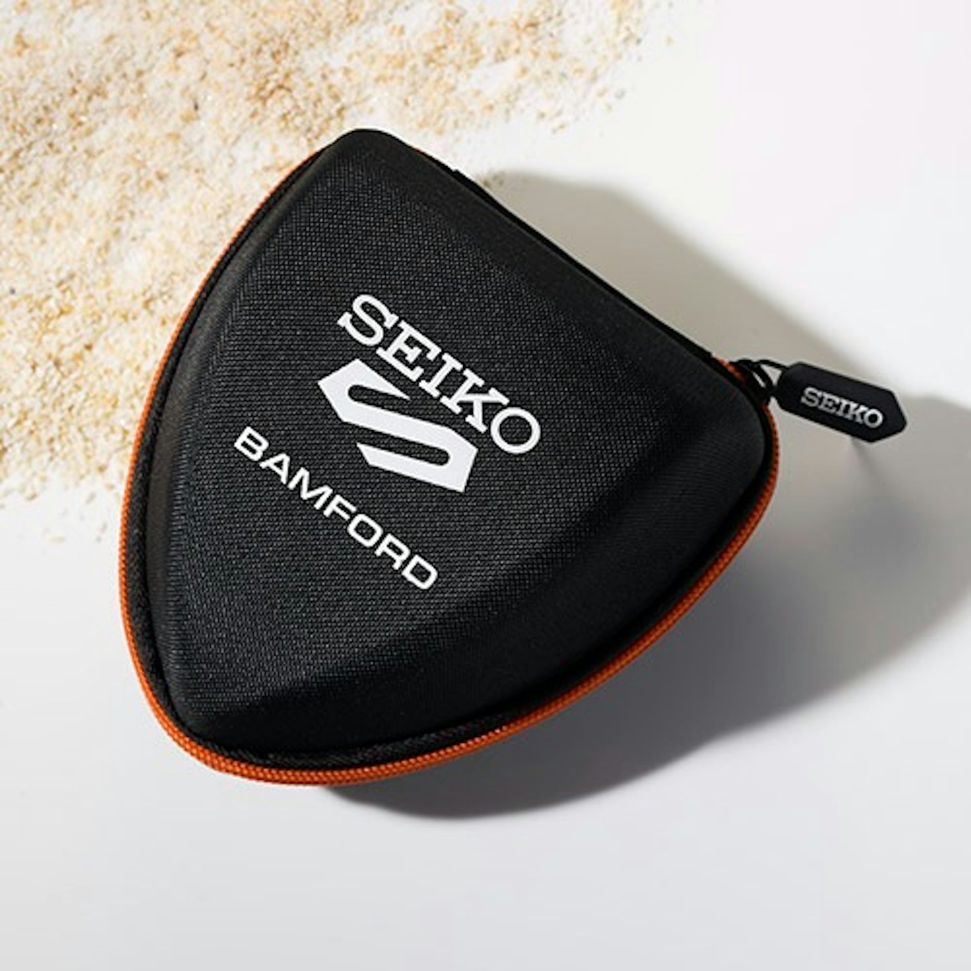 The watch features a blue translucent dial that allows you to see the day and date discs (in English and Japanese) that rotate under the dial. The hands (in silver and orange) and applied hour markers (all of which are filled with LumiBrite) reference the 1980s SKX designs. The unidirectional dive bezel features the first 20 minutes of the scale in orange, and the crown remains at 4 o’clock. The front side features a curved Hardlex crystal, while the display screwback prominently features the Bamford logo.