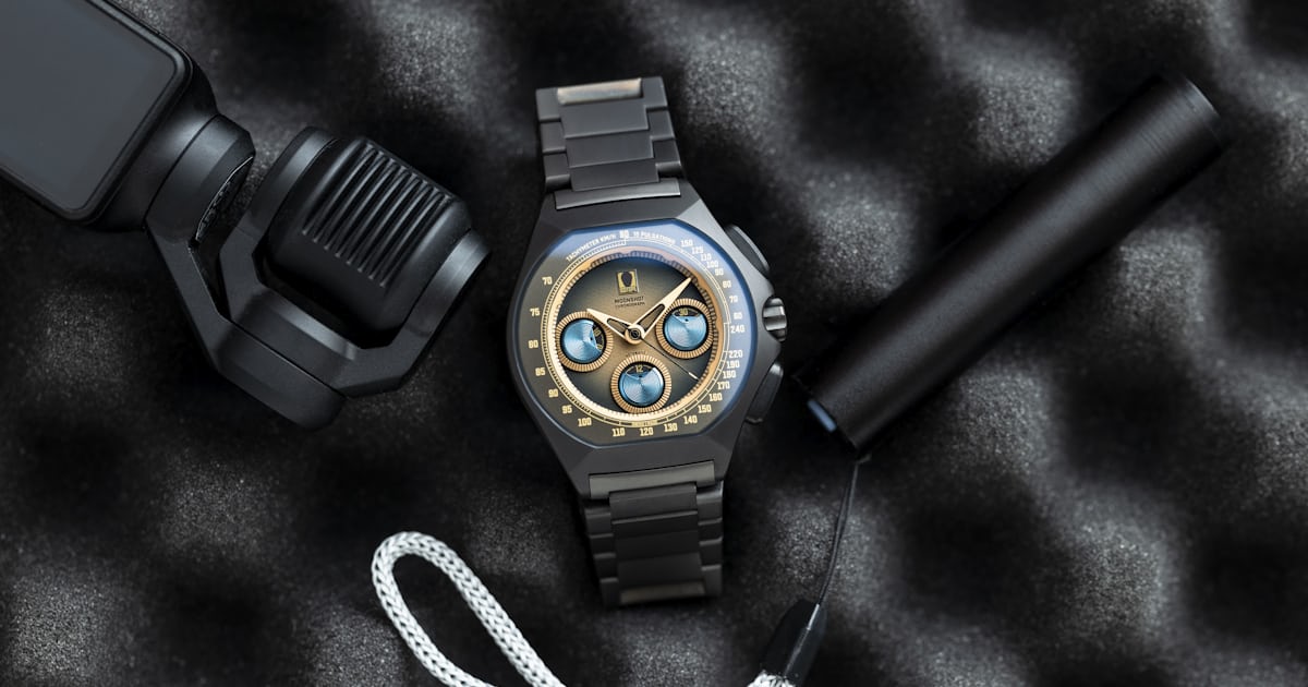 I mention these details because the Moonshot is one of those watches that can be hard to understand without the use of one’s fingertips. Sure, it’s a modern microbrand, but there isn’t a single piece of this watch that feels as though it was selected from a catalog. The case is quite complex, with a relief cut into its 9 o’clock side, and don’t miss small details like the vent-like finishing on the pushers, the playful “play/pause” and “loop” logos on the underside of the pushers, the logo shape milled into the crown, the quick-release bars built into the bracelet (and the included rubber strap), and the use of single-sided screws for the bracelet. And all this is before we get to the dial.